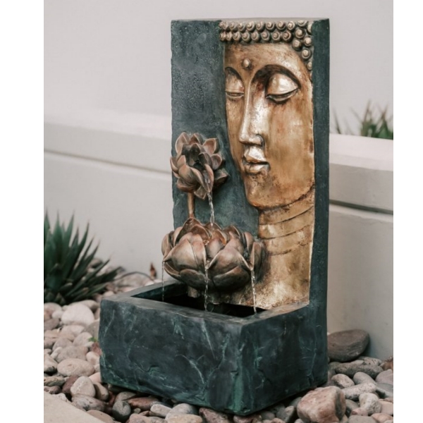 Cascading Lotus Buddha Face Indoor Outdoor Zen Water Fountain w/LED Light, 30 Inch Tall, Bronze and Natural Grey